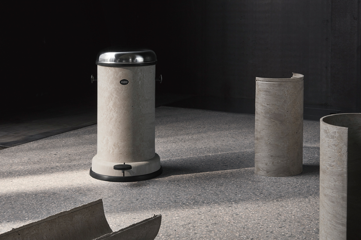 Rubbish Bin,將 Vipp 自 1939 年的經典腳踏垃圾筒 Vipp Bin,以嶄新再生材質製作,讓擁有 75% 粗曠素材的 Rubbish Bin ,展現出混凝土般的灰色樣貌。選用 1939 年創辦人 Holger Nielsen 在丹麥蘭德斯製造的首件腳踏垃圾筒 Vipp15,挑戰品牌自身產品餘料結合於 Vipp Bin 的生產過程,進而使製程的原物餘料減少,為地球這片土地,環保再生亦共生。