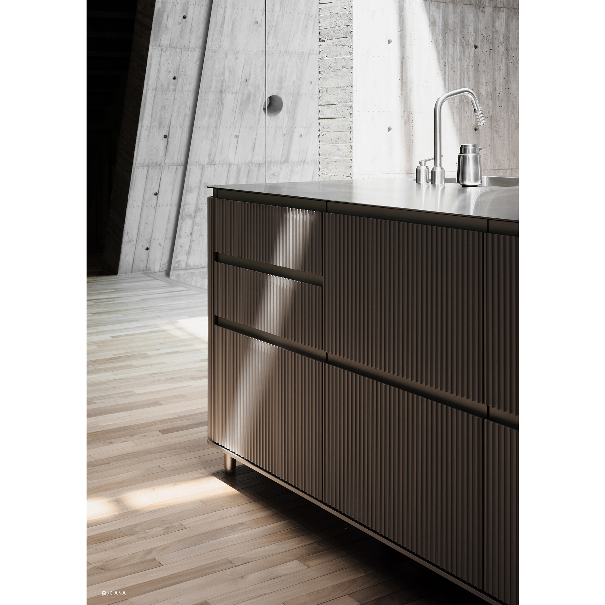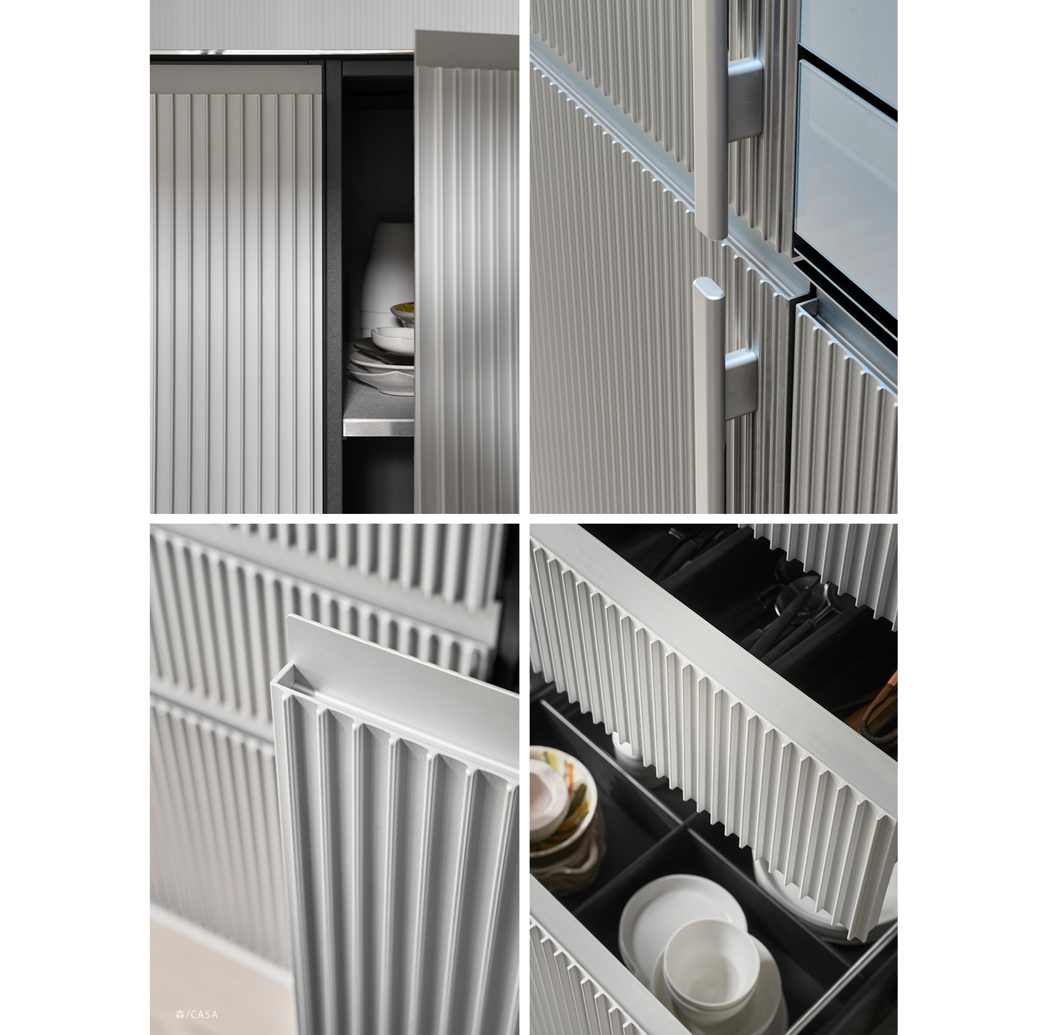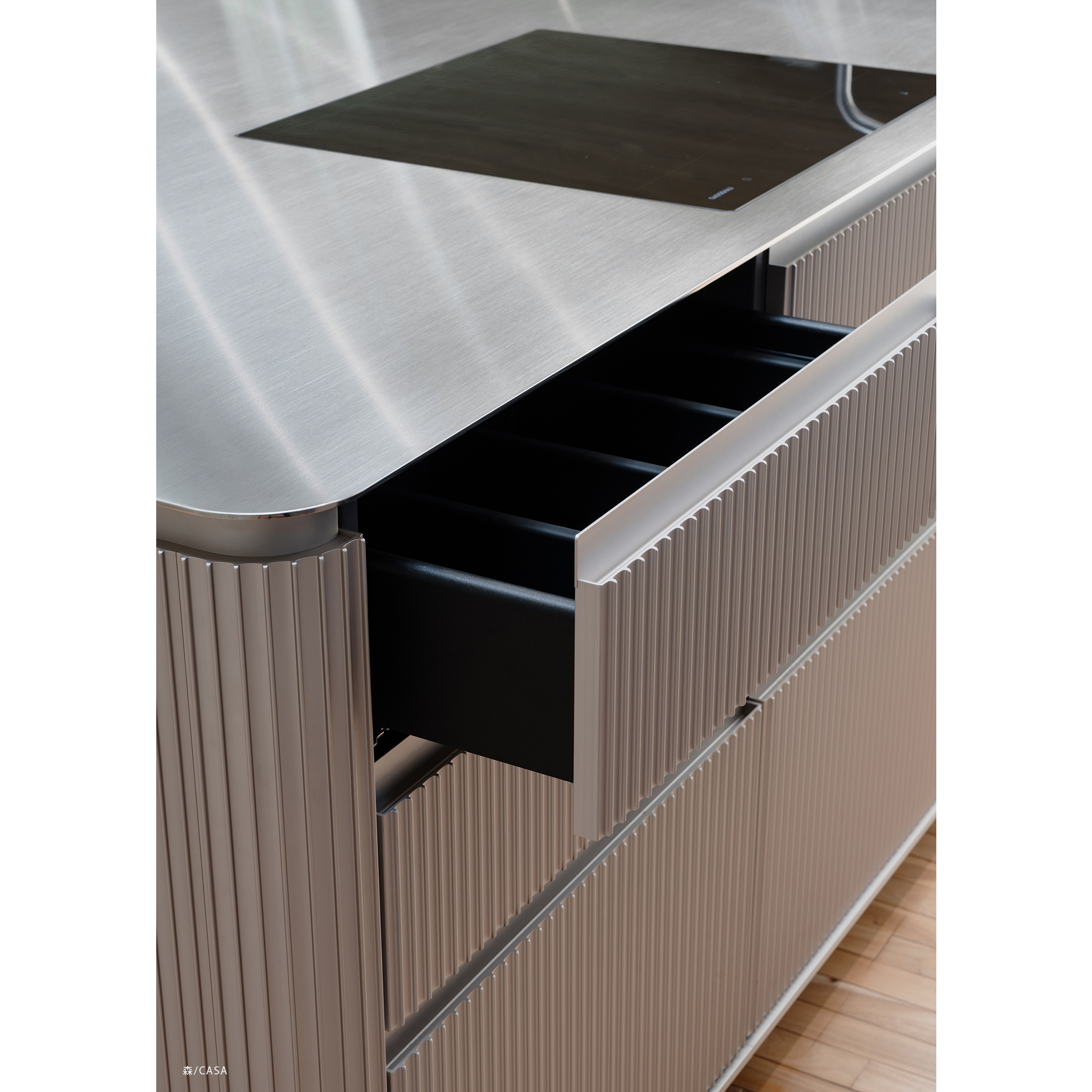 V3 Kitchen 以波浪直條紋壓印的銀灰鋁,輕巧轉化沈重厚實的櫃體。櫥櫃抽屜配備高規格 Blum 的緩衝五金零件;門片為隱藏式把手,低調設計至抽屜門片內側;高櫃冰箱則為外顯式長把手,可承受厚重密封櫥櫃門片的重量及壓力。每一單位櫃體上方,乘載著 4 公釐厚重的不鏽鋼檯面,優雅懸浮在櫃體之上。