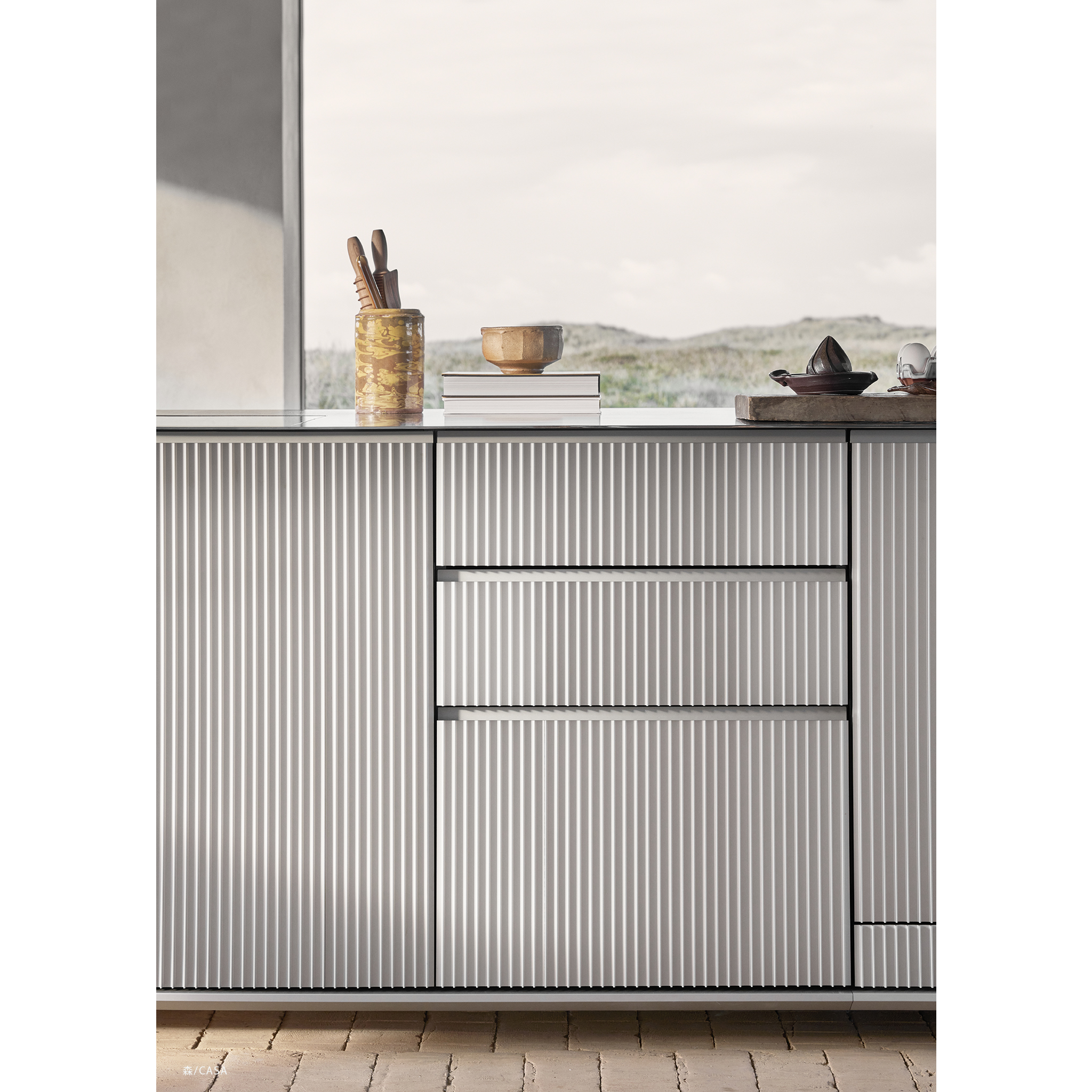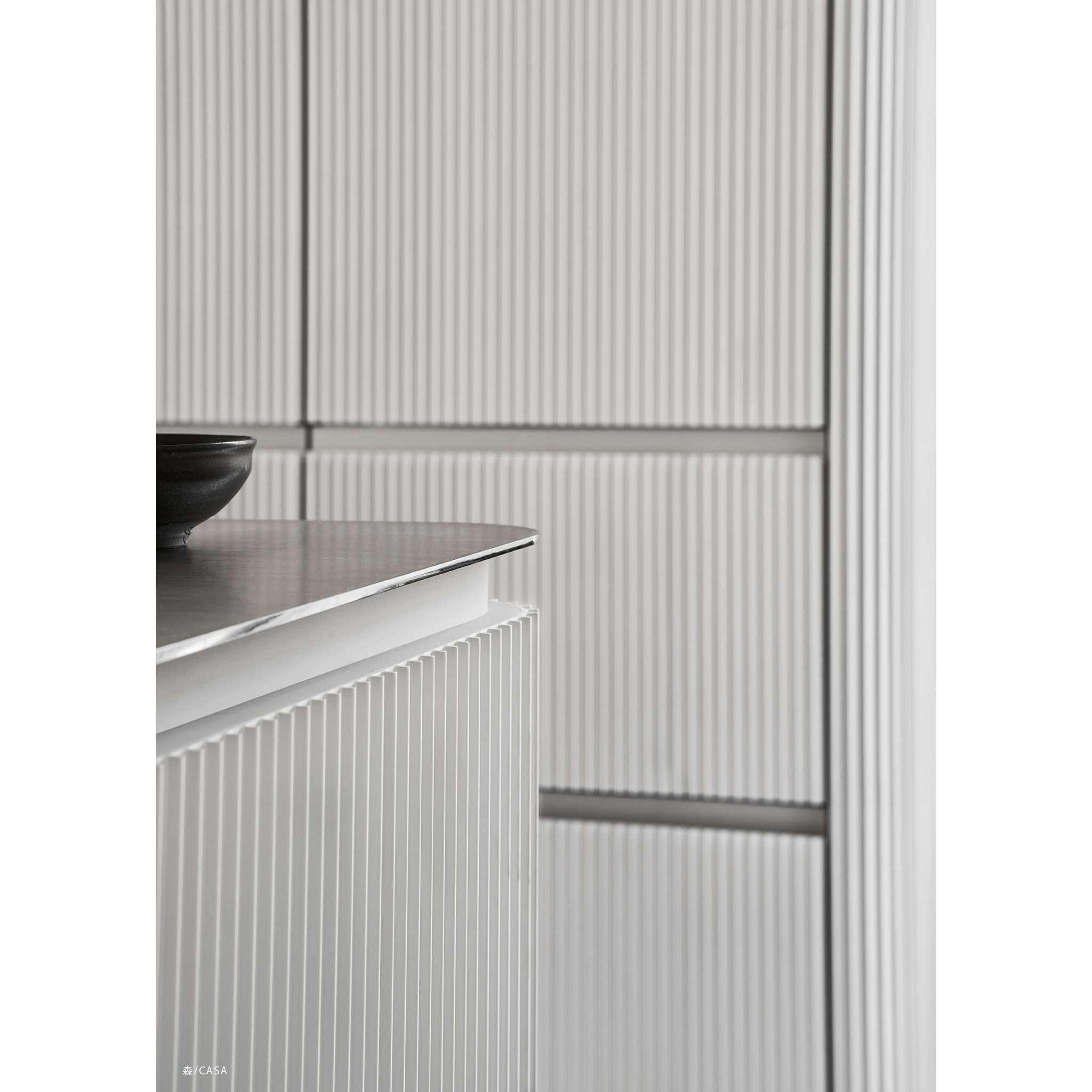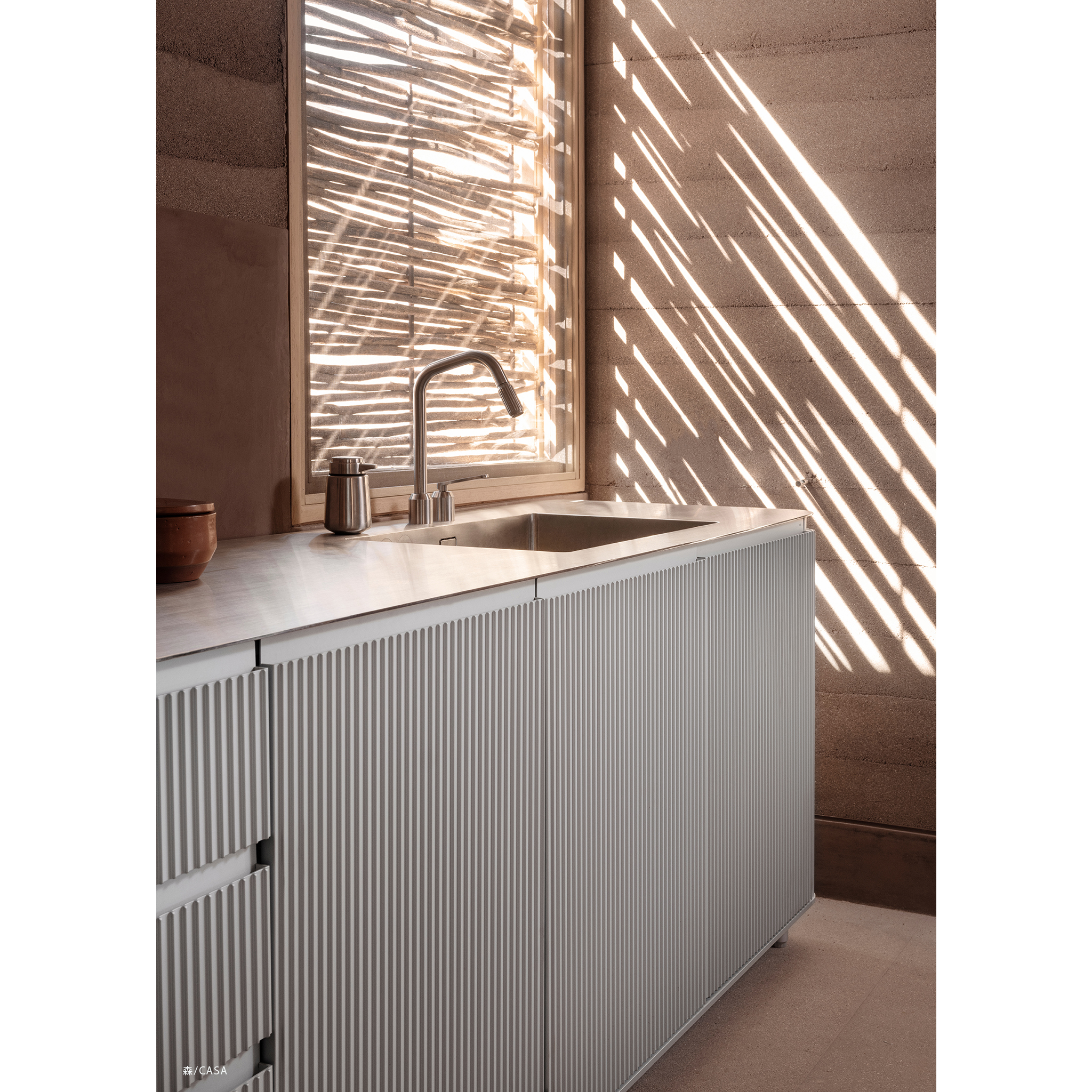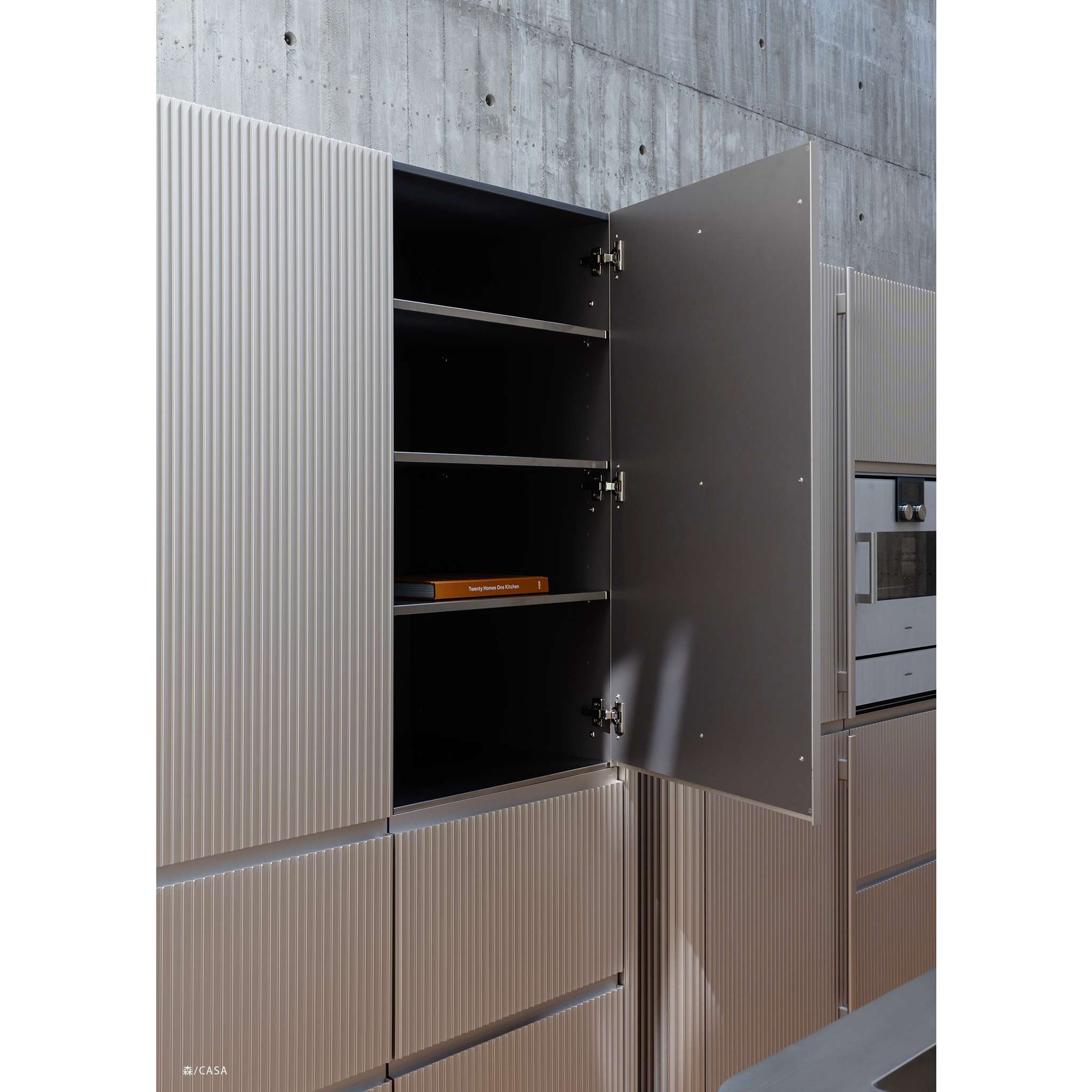 V3 Kitchen 以波浪直條紋壓印的銀灰鋁,輕巧轉化沈重厚實的櫃體。櫥櫃抽屜配備高規格 Blum 的緩衝五金零件;門片為隱藏式把手,低調設計至抽屜門片內側;高櫃冰箱則為外顯式長把手,可承受厚重密封櫥櫃門片的重量及壓力。每一單位櫃體上方,乘載著 4 公釐厚重的不鏽鋼檯面,優雅懸浮在櫃體之上。
