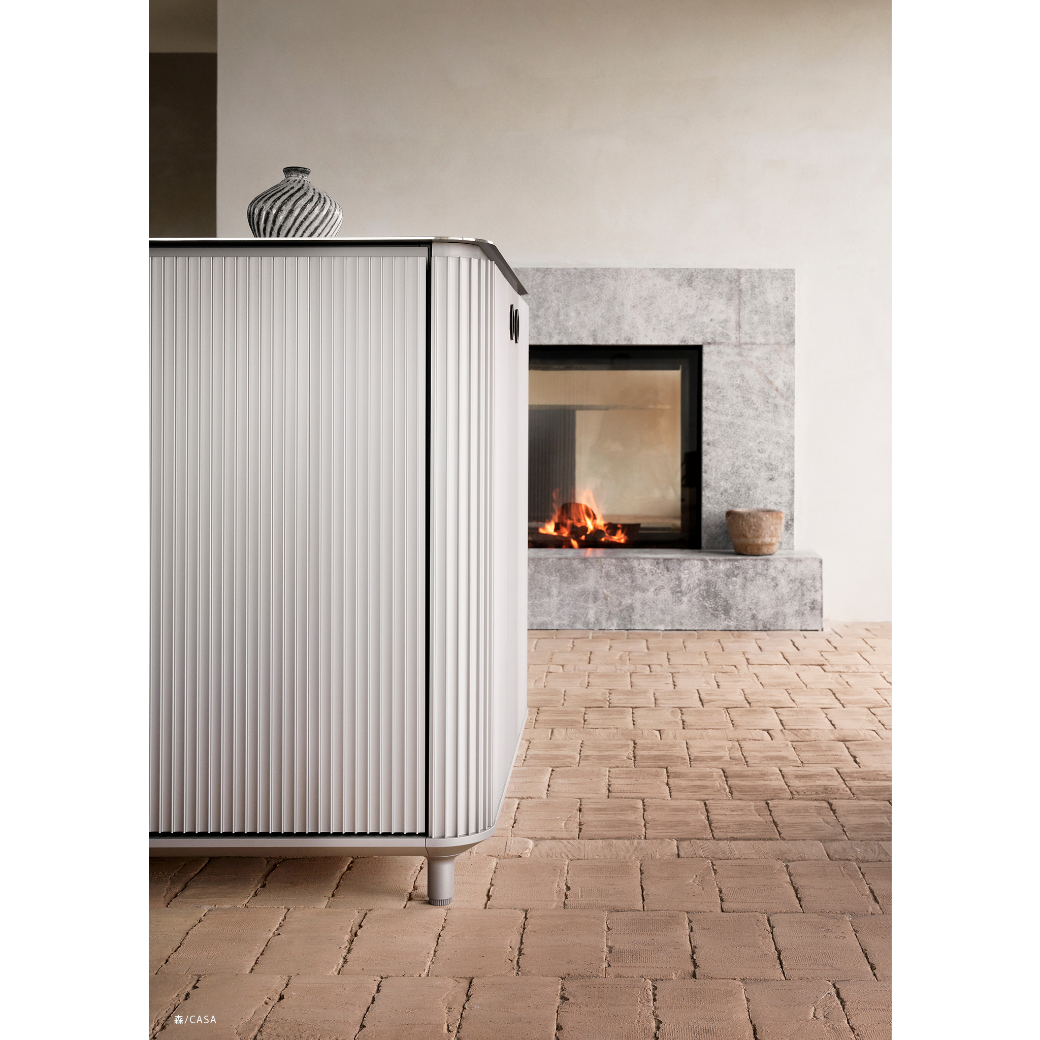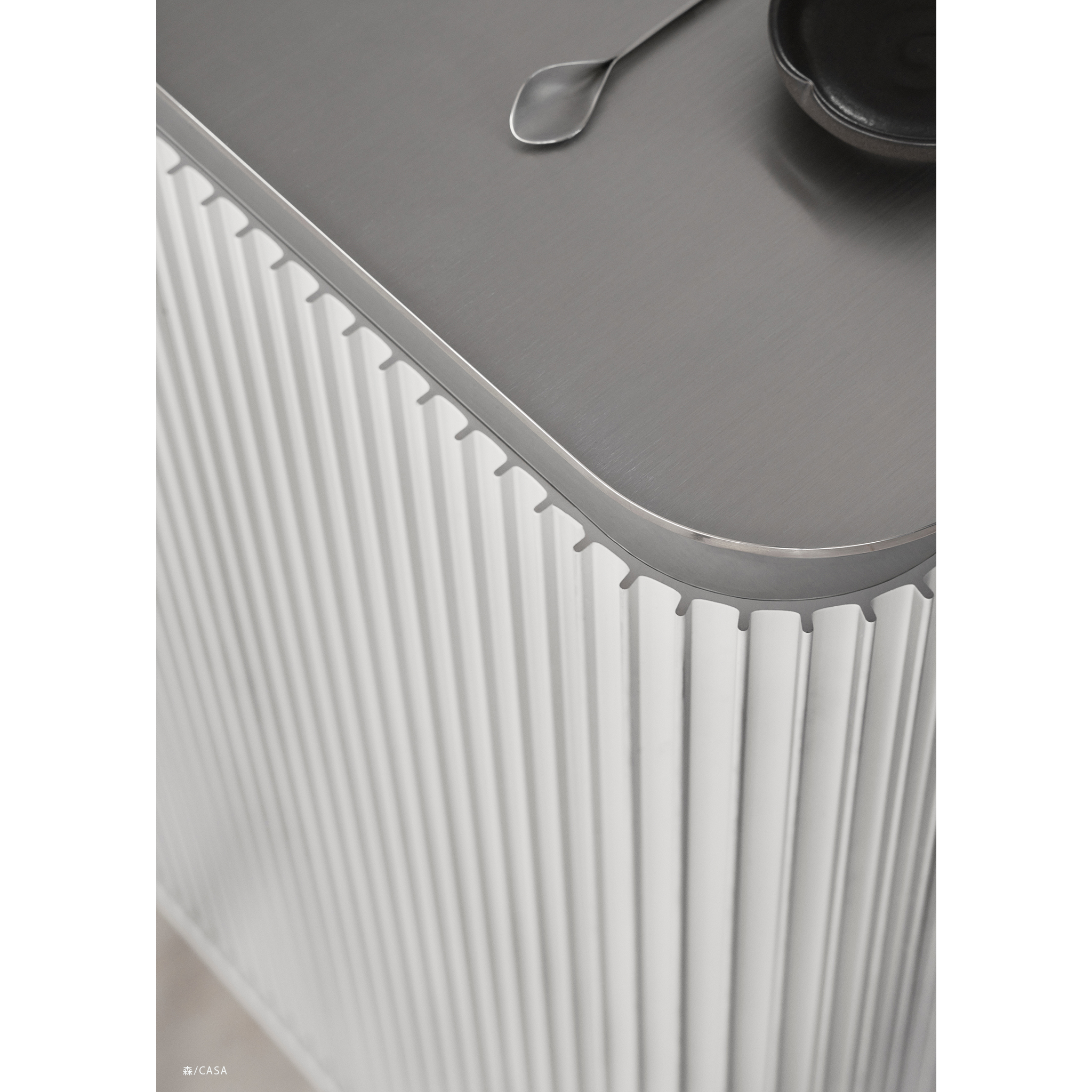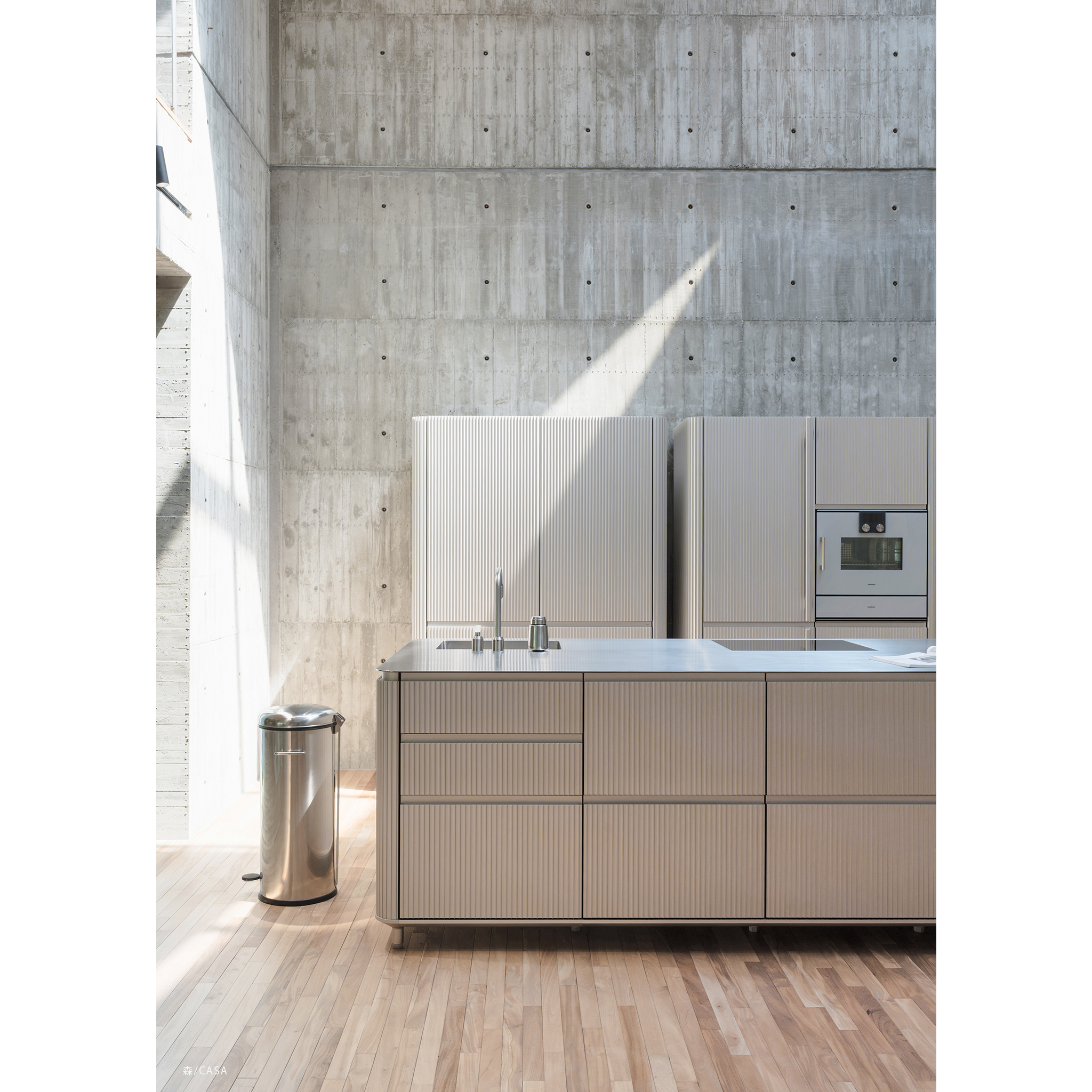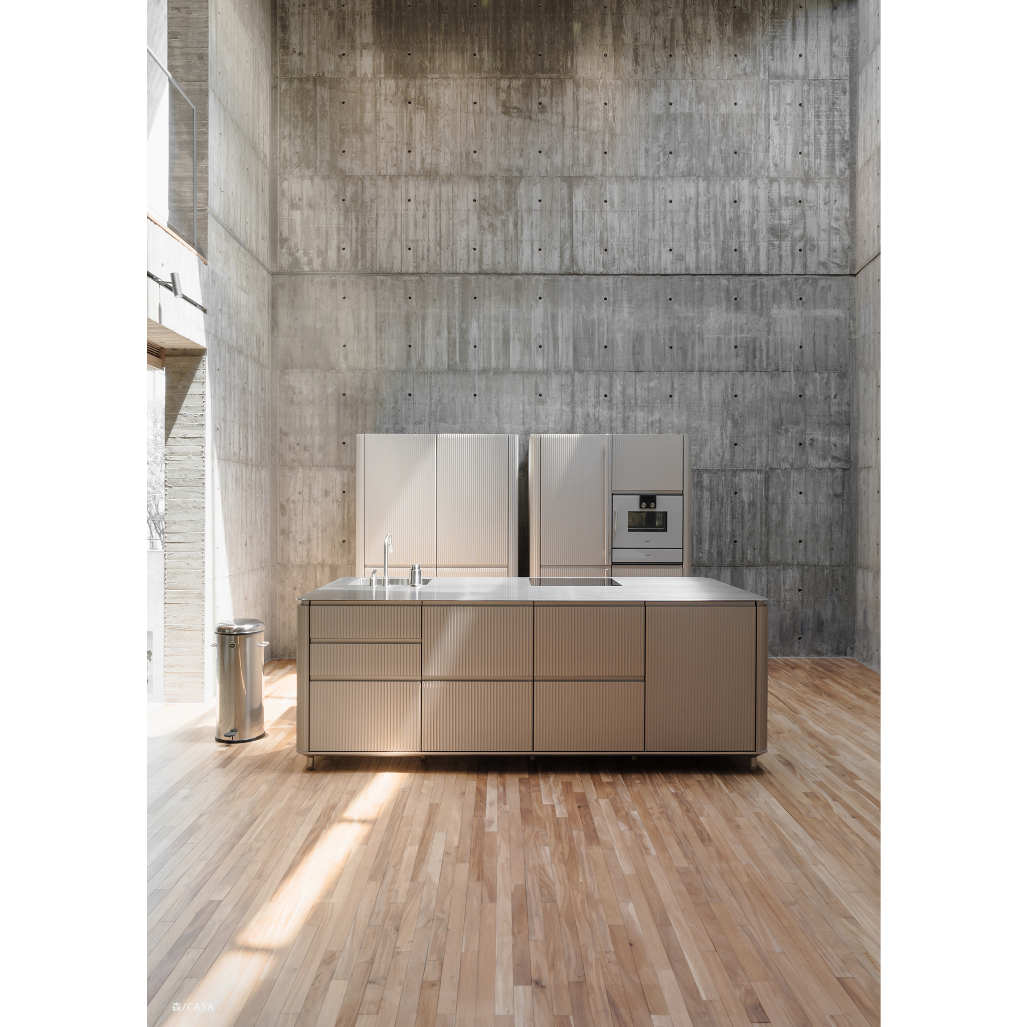 銀灰鋁的波浪製作非常困難,鋁材色彩製作的一致性更為不易,在經過層層關卡試煉之下,最終克服各式難關。優雅離地的銀灰鋁櫃體與圓潤轉角的彎曲線條,展現堅實又輕盈的獨特美感。每一個元件,皆由 Vipp 獨家設計;每一片檯面,是以一體成型的不鏽鋼打造;每一處細節,都寫著 Vipp 專屬的設計語彙,清晰展現品牌傳承的堅持與脈絡。