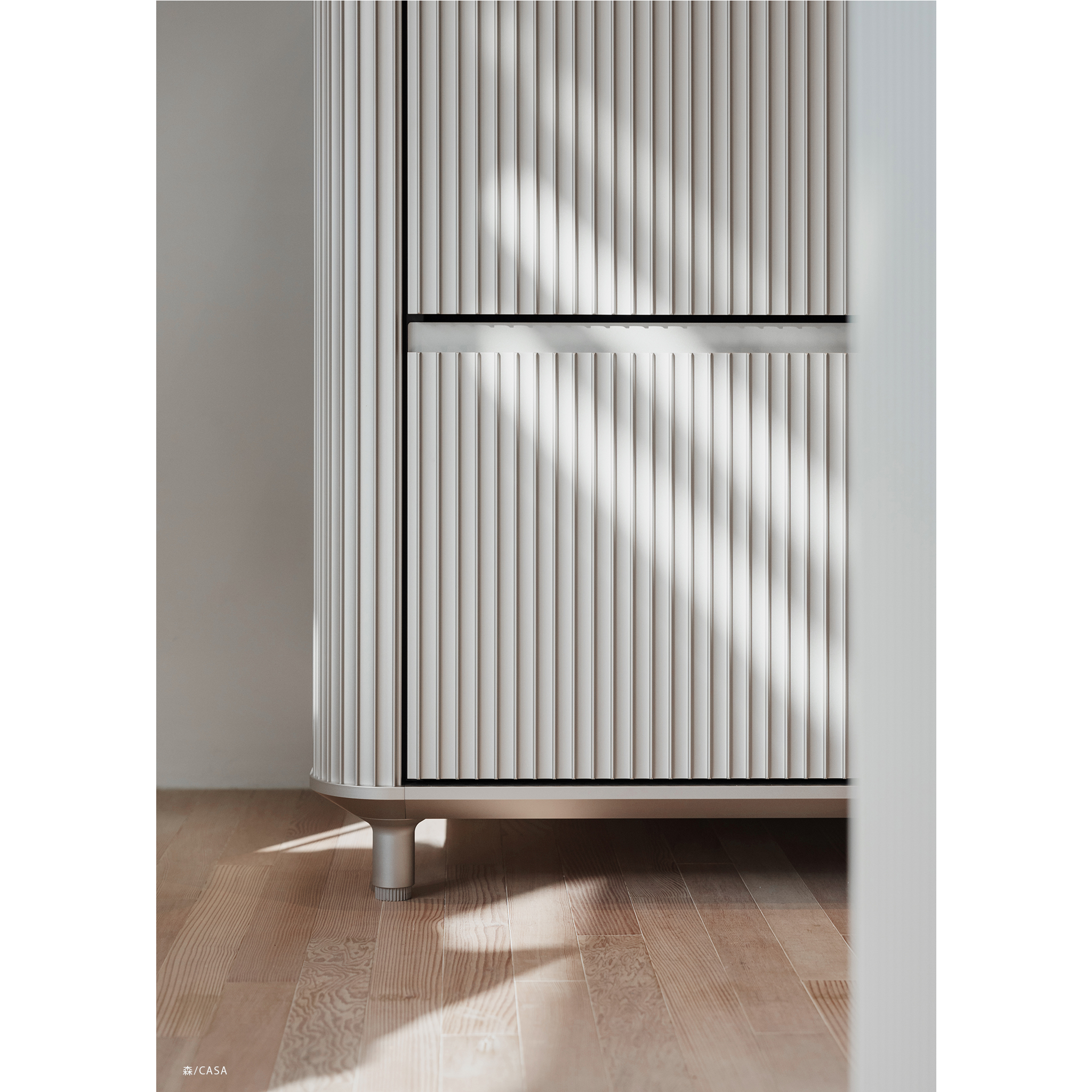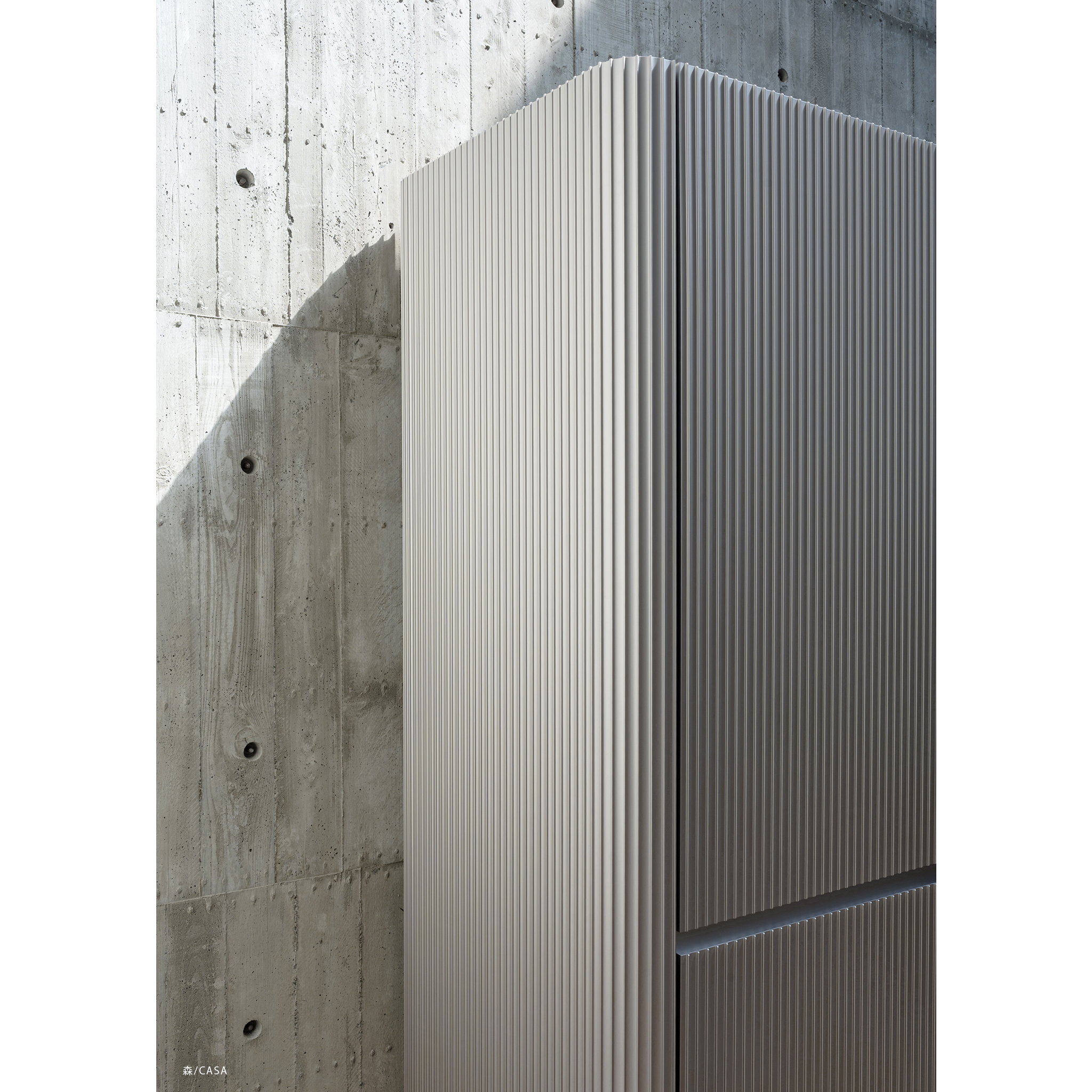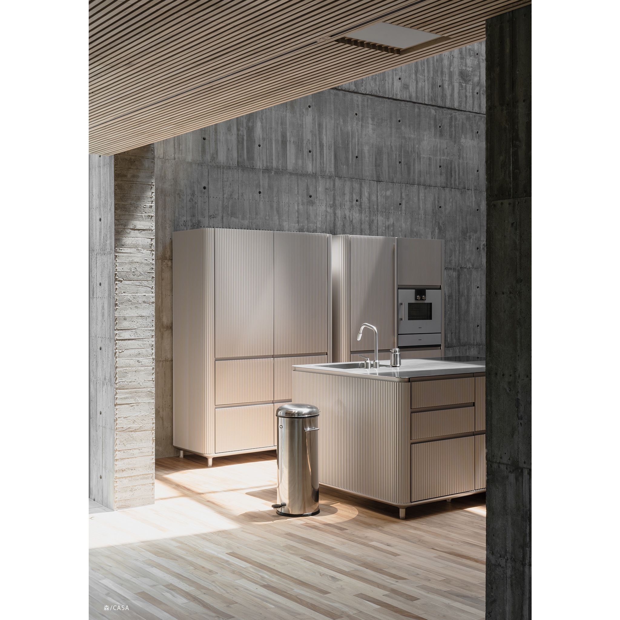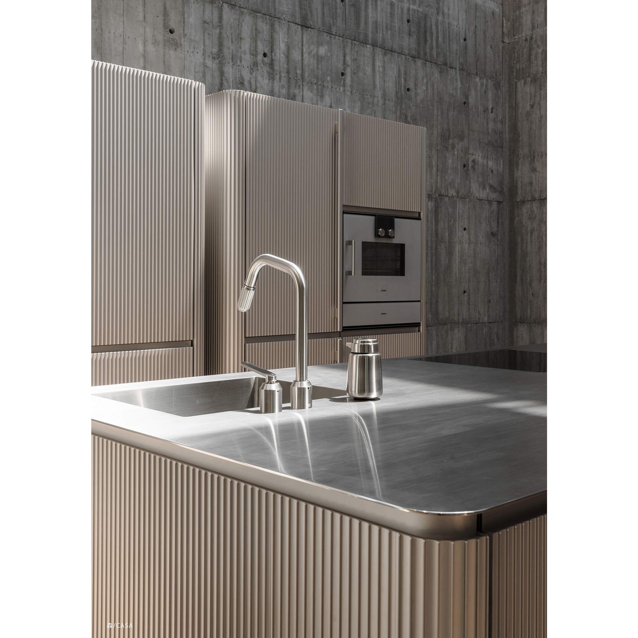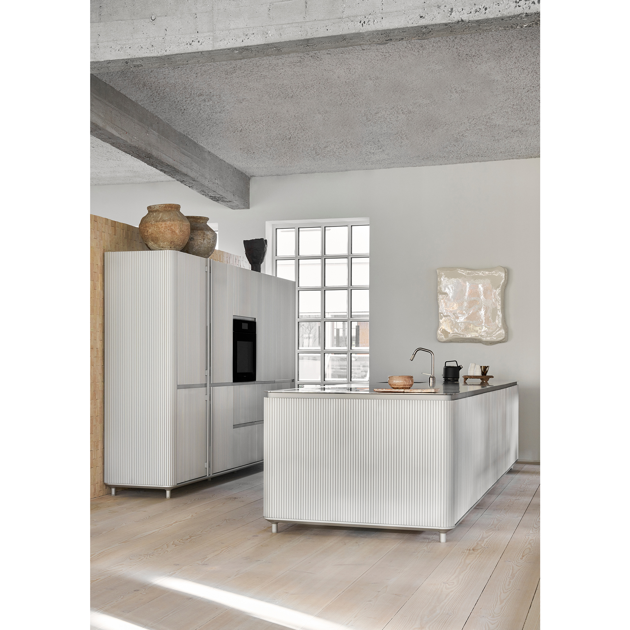 V3 Kitchen 以 Vipp 模組化設計延續廚具架構,優雅展現輕巧的廚房美學。採用陽極氧化鋁素材,經由特殊加壓技法,呈現垂直的櫃體表面。層壓的弧度環繞櫃體外圍,透出銀灰鋁的獨特魅力,透過光線呈現出細膩的光澤變化,帶來輕盈舒適的淺調明亮,柔和日常的生活空間。