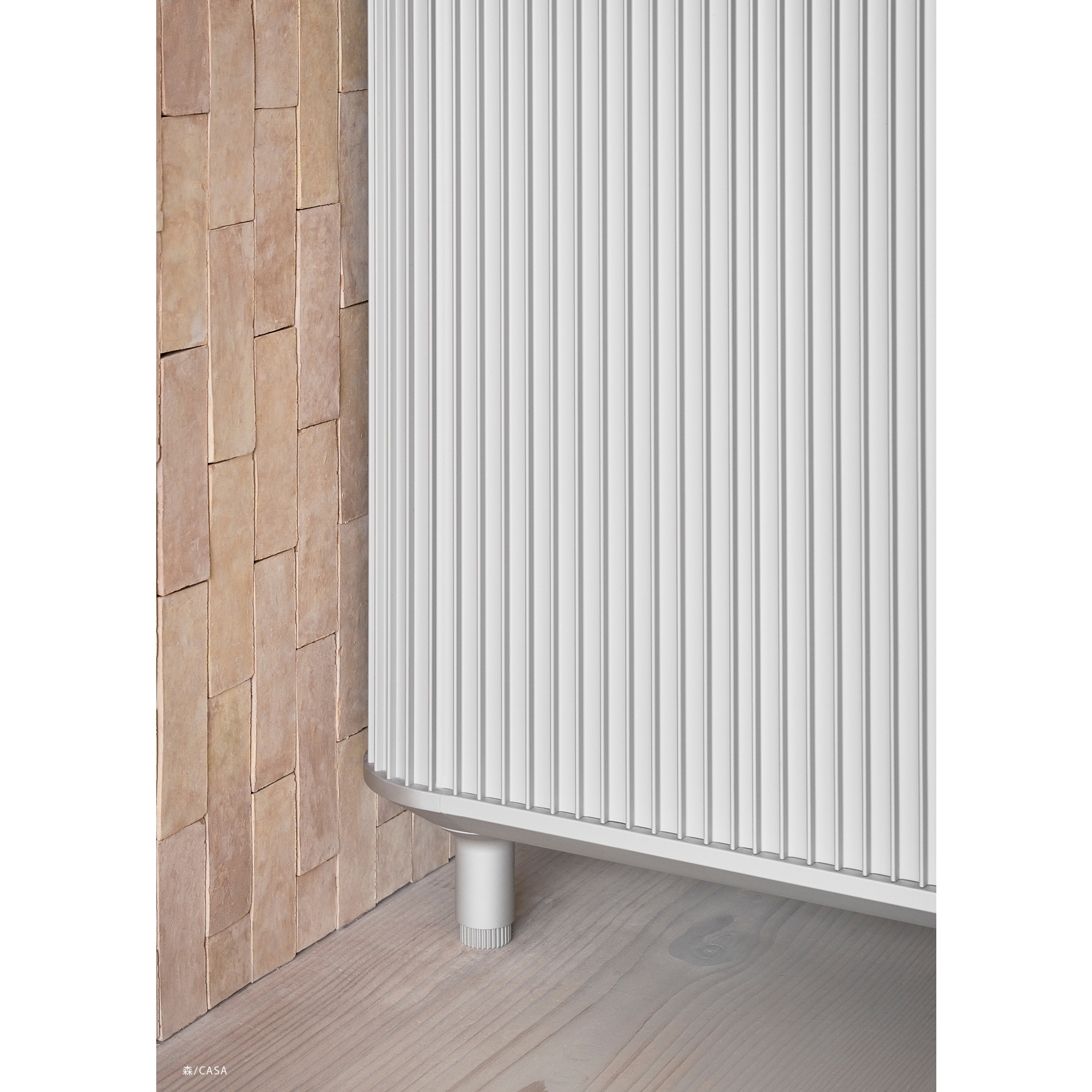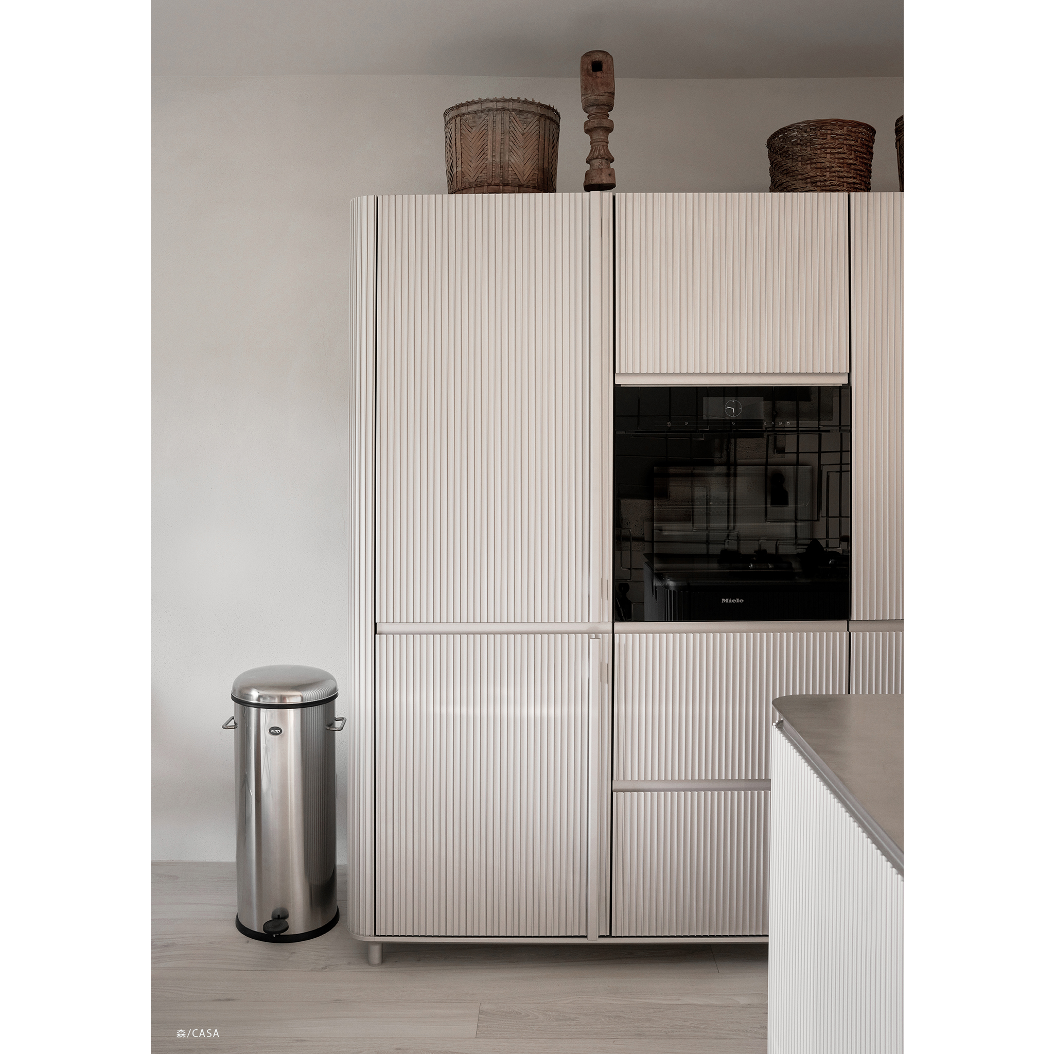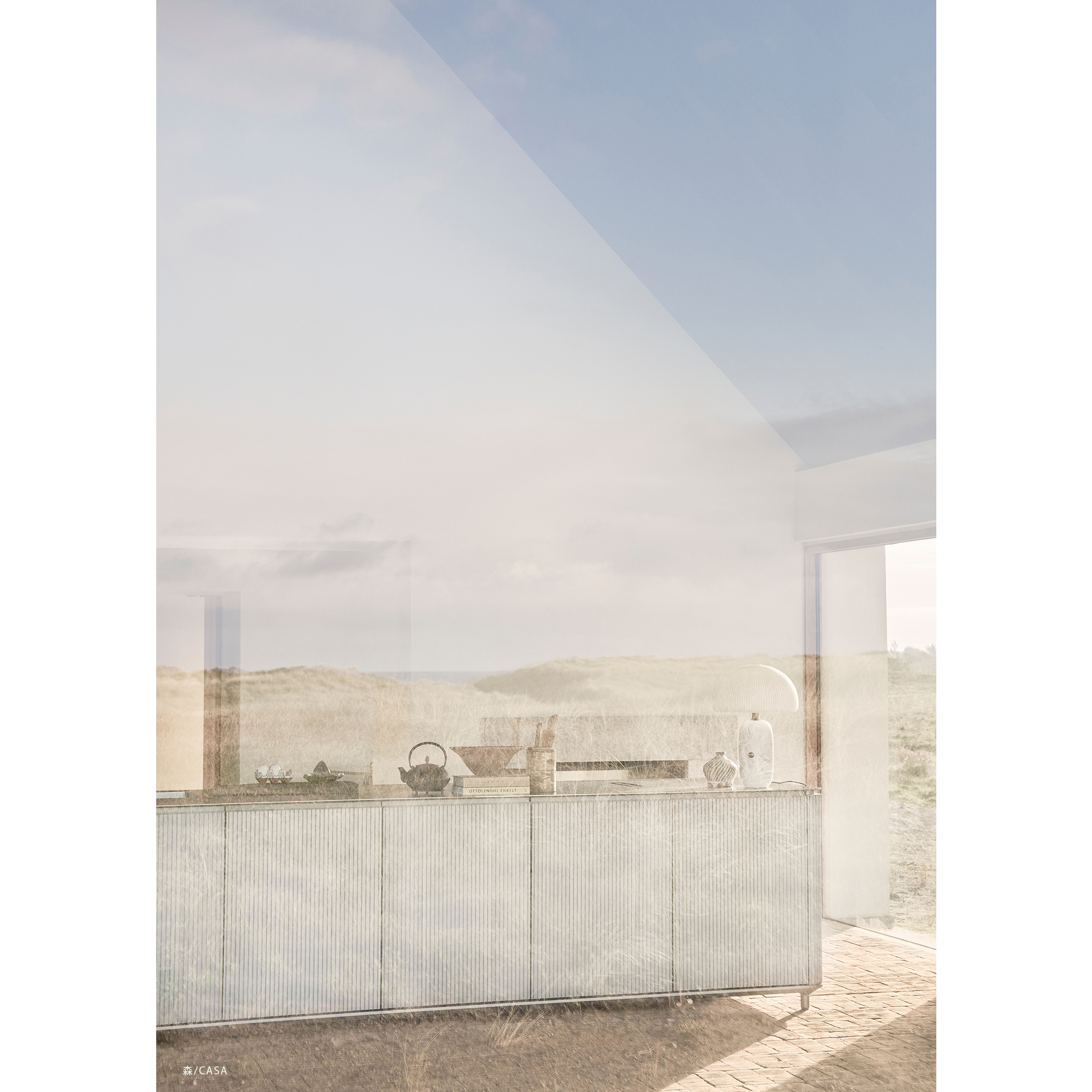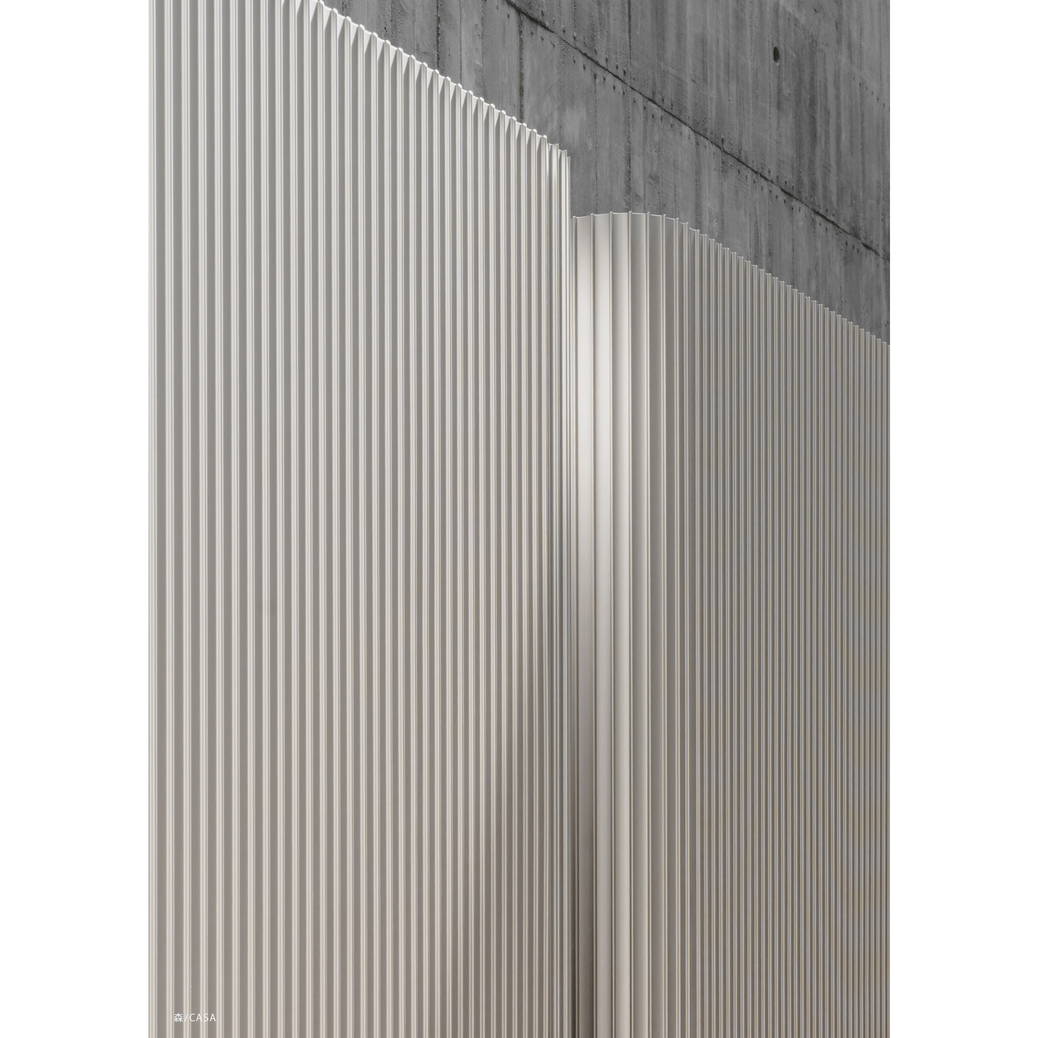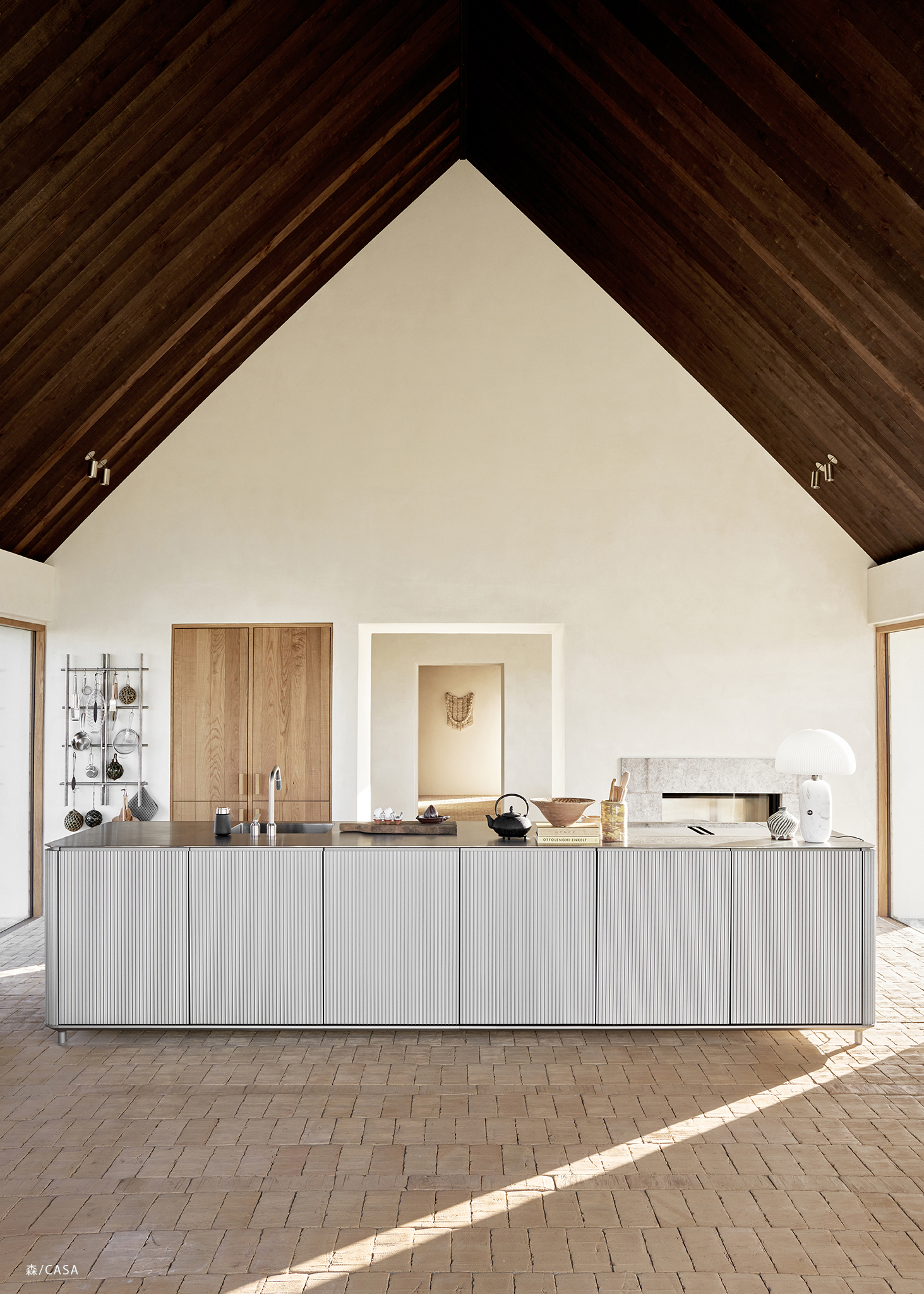 V3 Kitchen 以 Vipp 模組化設計延續廚具架構,優雅展現輕巧的廚房美學。採用陽極氧化鋁素材,經由特殊加壓技法,呈現垂直的櫃體表面。層壓的弧度環繞櫃體外圍,透出銀灰鋁的獨特魅力,透過光線呈現出細膩的光澤變化,帶來輕盈舒適的淺調明亮,柔和日常的生活空間。