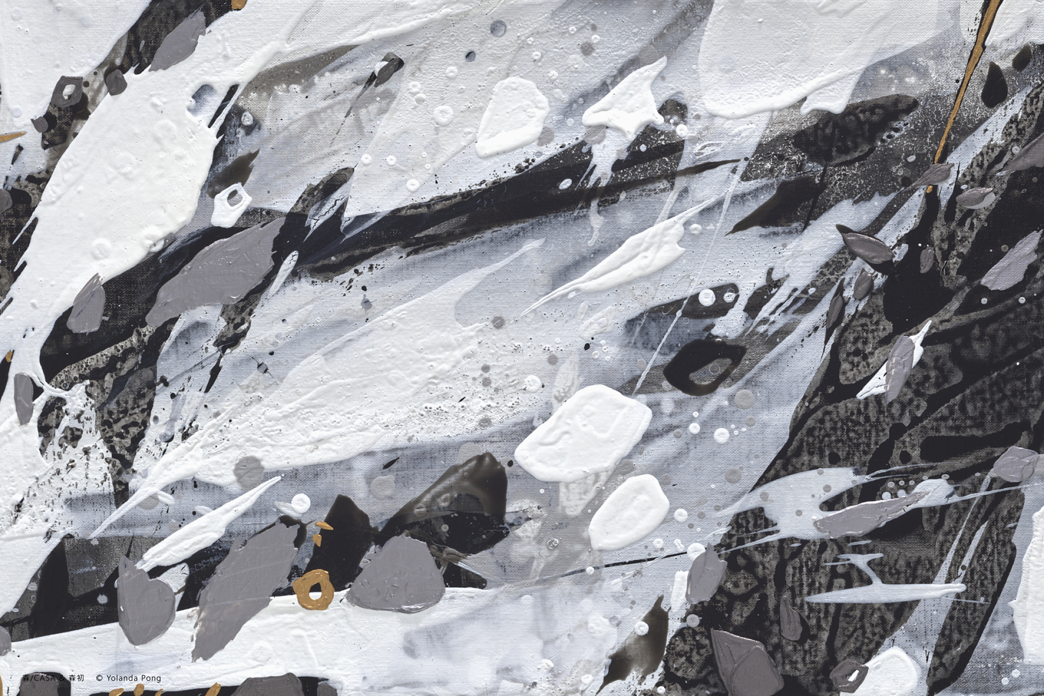 龎銚,以黑白灰的簡練與金屬調的相遇,在畫面空間結構與平衡中,呈現繪畫最純粹的本質。融合抽象表現主義與不定形藝術,藉各媒材間的相互交錯,完整虛實與互映的型態。