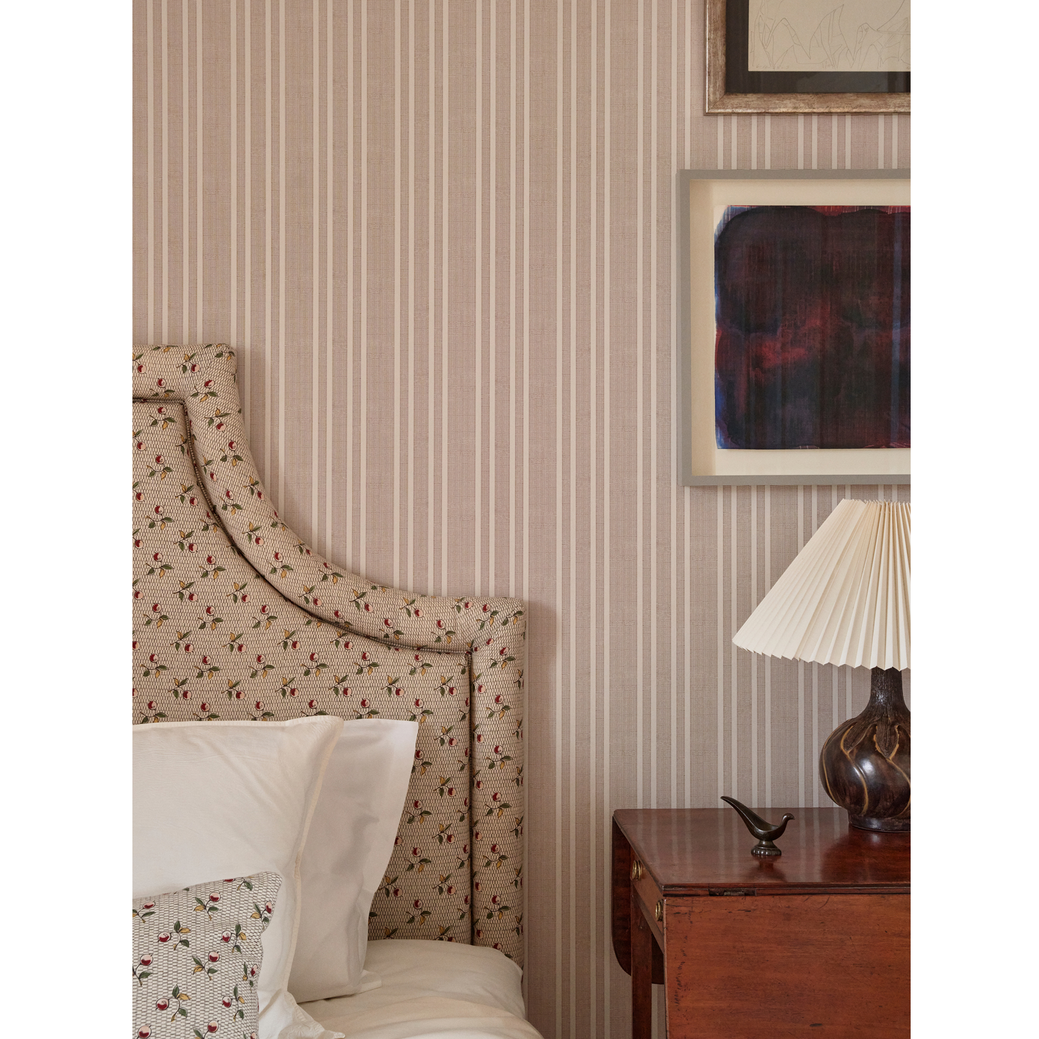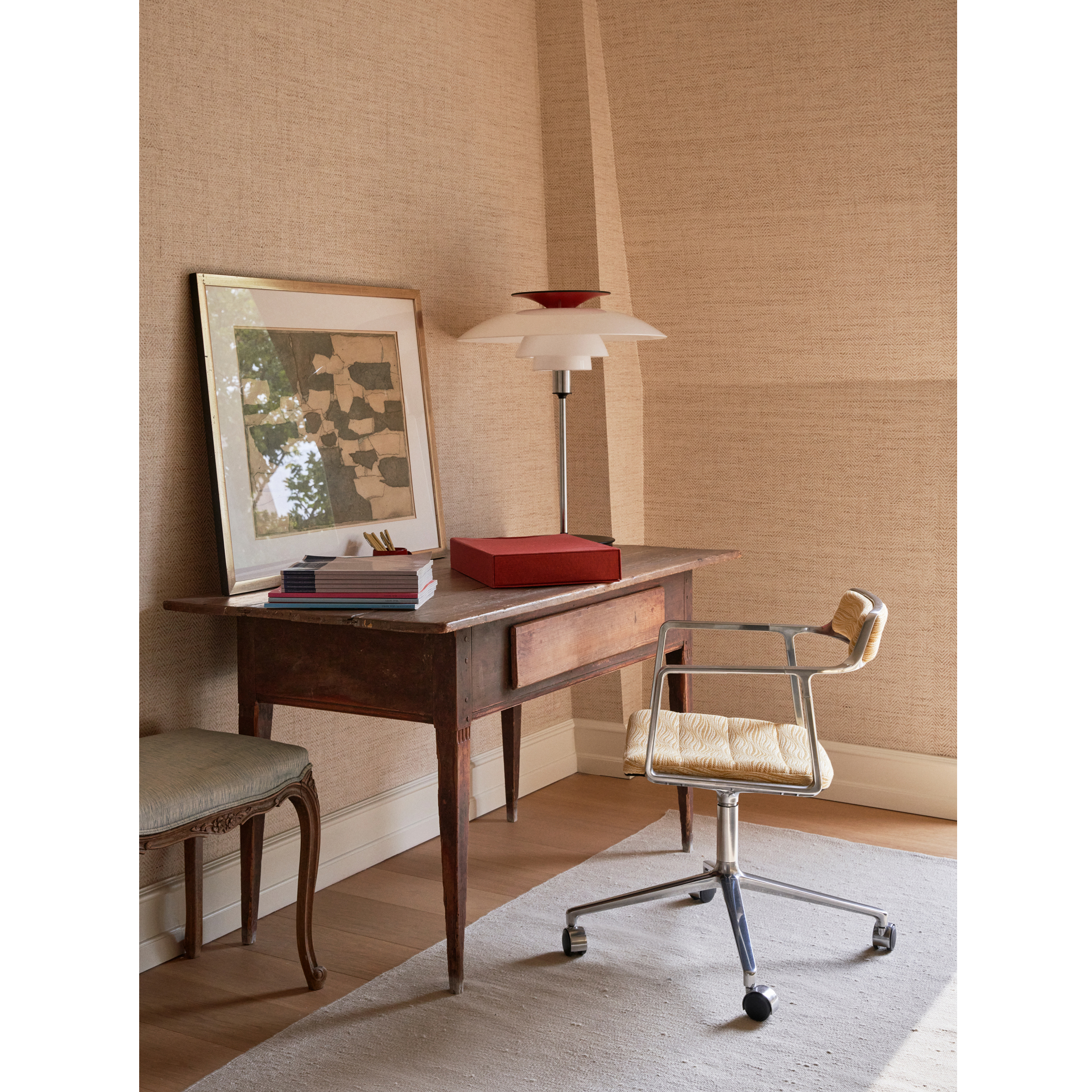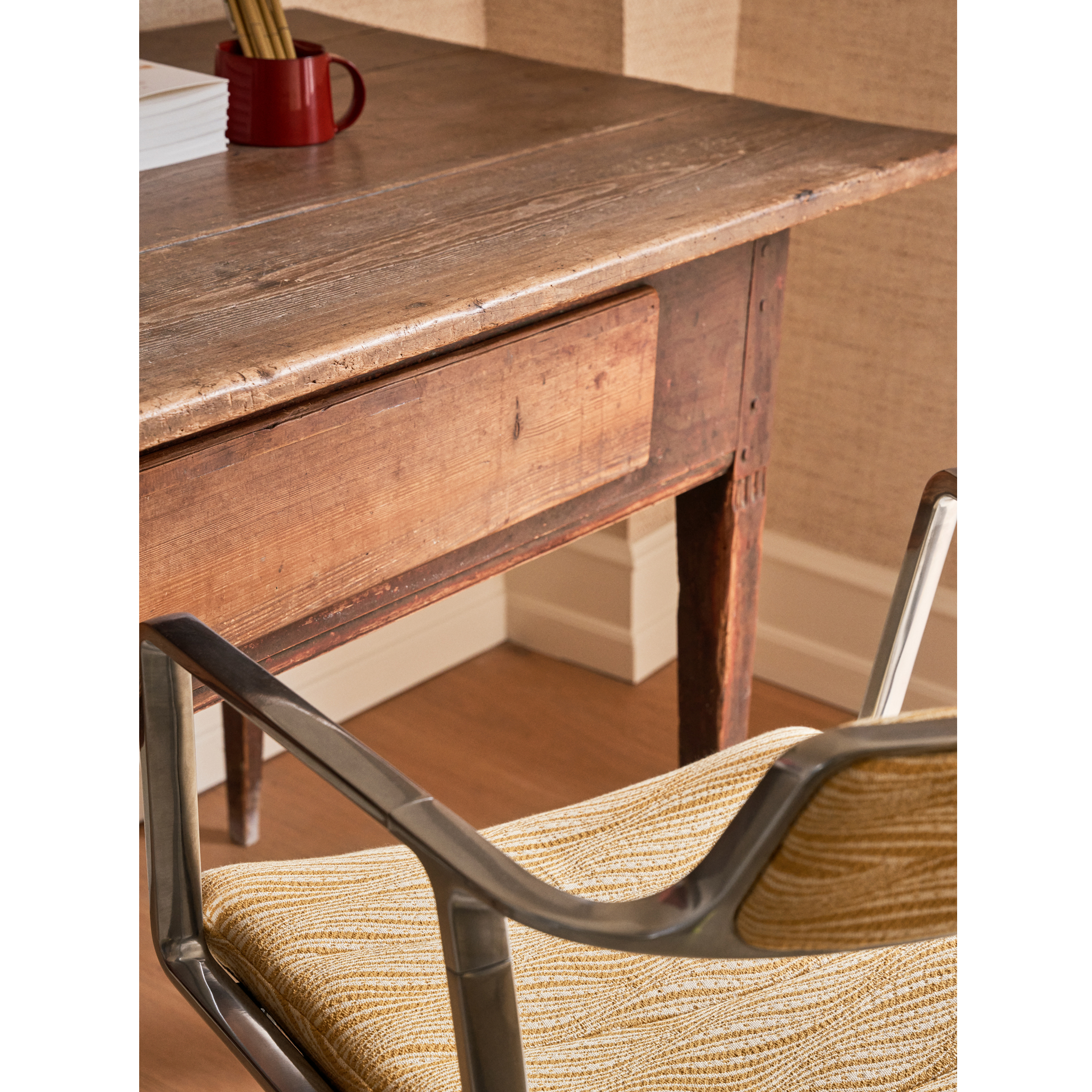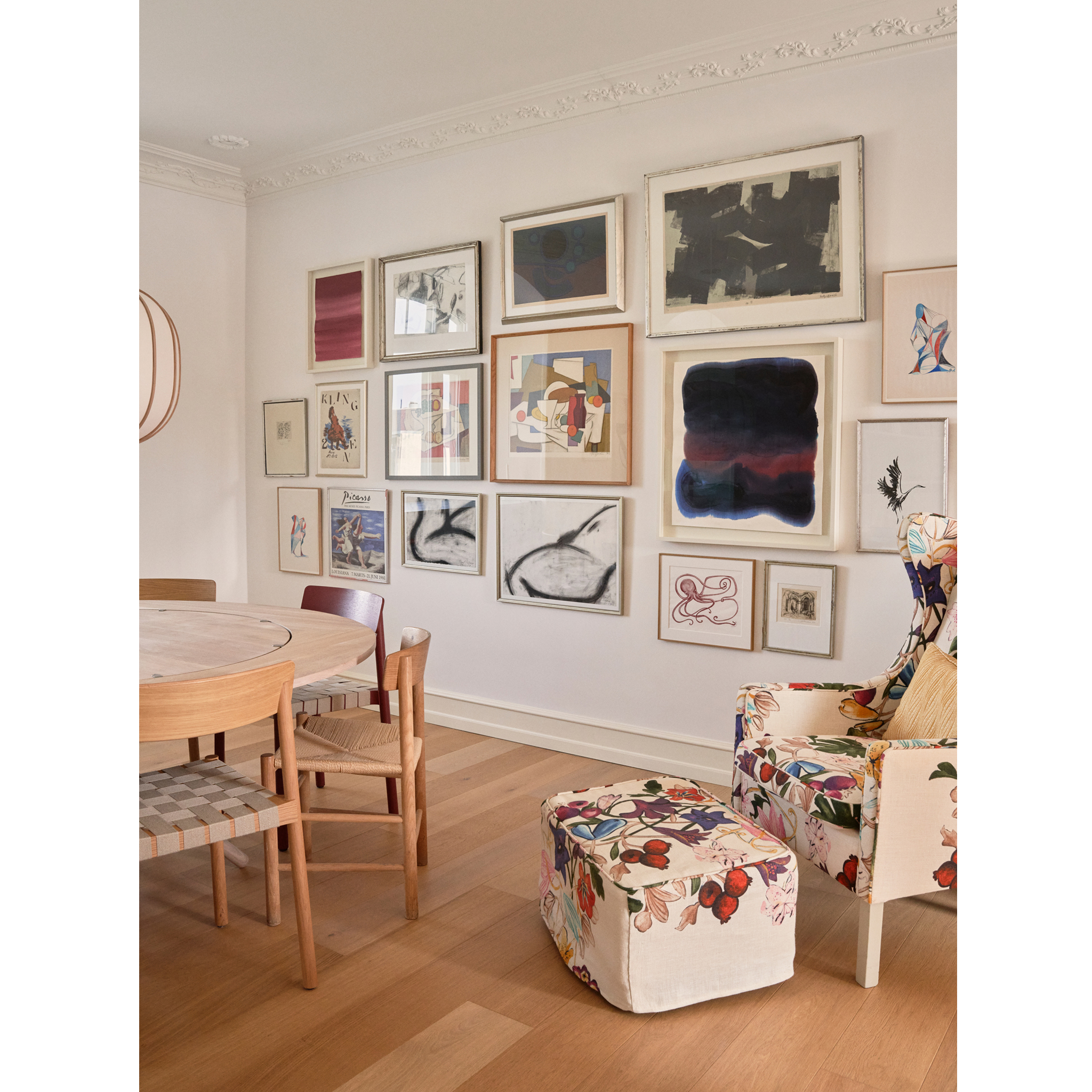 沿著長廊前行,即通往三間臥室,每間皆以掛毯、壁紙與織品,展現各自獨特個性。小型的辦公空間中,則配置一張復古木製書桌,搭配特別訂製的 Vipp 辦公椅。椅墊採用淺黃色圖騰包覆,與牆邊的沙發相互呼應。而牆上也點綴著 Sofia 的藝術創作,使空間更增添豐富的視覺層次。